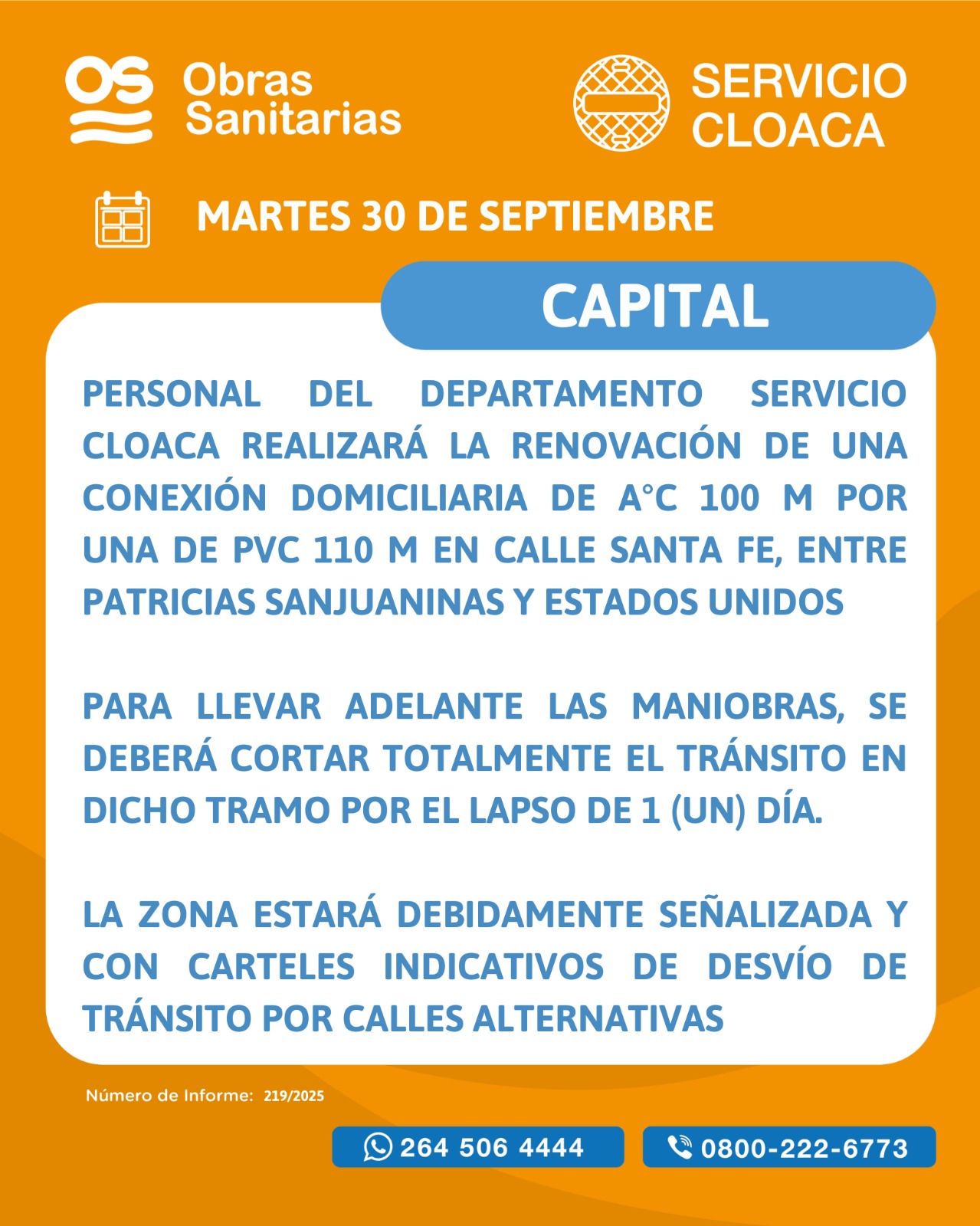 El Departamento de Servicio Cloaca de OSSE informó que este martes 30 de septiembre se llevará a cabo un corte total de tránsito en calle Santa Fe, en el tramo comprendido entre Patricias Sanjuaninas y Estados Unidos, en la Ciudad de San Juan. La medida se debe a trabajos de mantenimiento y renovación de cañerías que forman parte de un plan de mejoras en el sistema cloacal.