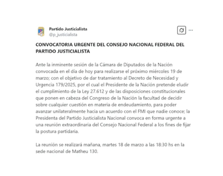 “Ante la inminente sesión de la Cámara de Diputados de la Nación convocada en el día de hoy para realizarse el próximo miércoles 19 de marzo; con el objetivo de dar tratamiento al Decreto de Necesidad y Urgencia 179/2025, por el cual el Presidente de la Nación pretende eludir el cumplimiento de la Ley 27.612 y de las disposiciones constitucionales que ponen en cabeza del Congreso de la Nación la facultad de decidir sobre cualquier cuestión en materia de endeudamiento, para poder avanzar unilateralmente hacia un acuerdo con el FMI que nadie conoce; la Presidenta del Partido Justicialista Nacional convoca en forma urgente a una reunión extraordinaria del Consejo Nacional Federal a los fines de fijar la postura partidaria”, dice el comunicado que lanzó el PJ en sus canales oficiales.