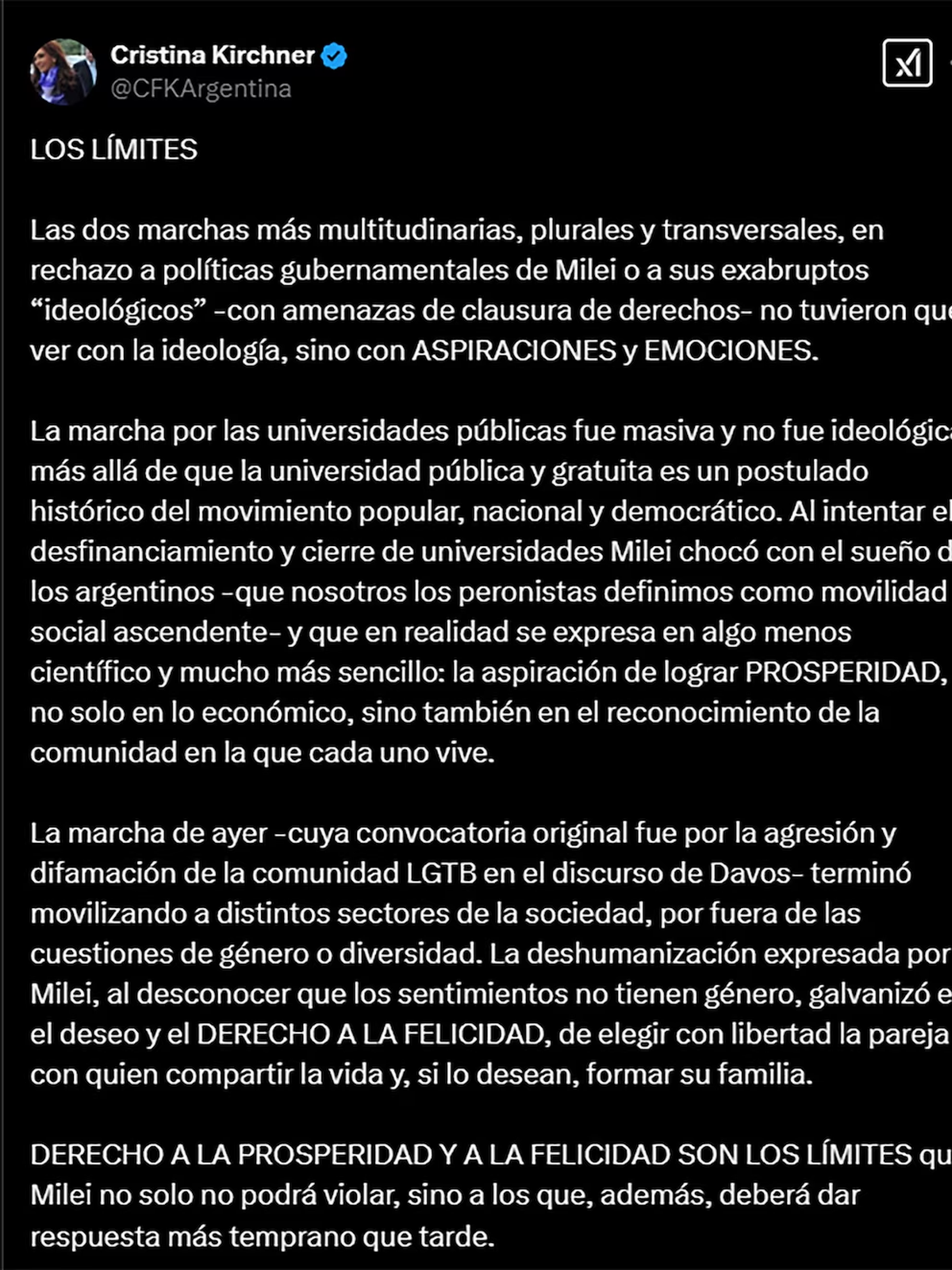 Cristina Kirchner cerró su publicación con una advertencia directa: “Los derechos a la prosperidad y a la felicidad son los límites que Milei no solo no podrá violar, sino a los que, además, deberá dar respuesta más temprano que tarde”.