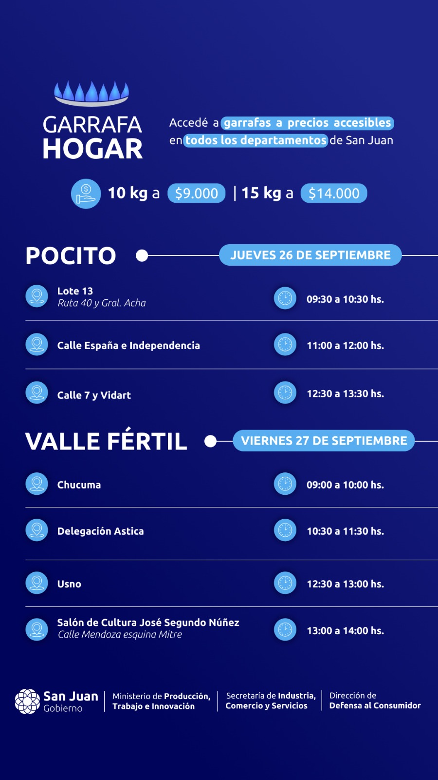 El ministerio de Producción, Trabajo e Innovación, a través de la Dirección de Defensa al Consumidor informa el cronograma de la última semana del Plan Garrafa Hogar impulsado por el gobernador Marcelo Orrego para llevar a los ciudadanos garrafas a un valor comercial accesible.