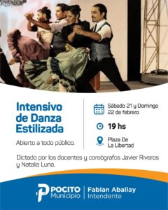 Este sábado 21 y domingo 22 de febrero, a las 19 horas, la Plaza de la Libertad será escenario de un Intensivo de Danza Estilizada abierto a todo público. La propuesta, organizada por la Dirección de Turismo y Cultura del Municipio de Pocito, invita a vecinos y amantes de la danza a participar de una experiencia formativa y artística al aire libre.