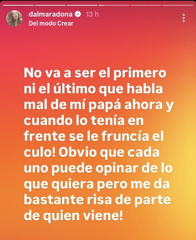 “Mi papá no es ejemplo de nada y él mismo lo dijo. Pero cuando escucho a ciertos personajes hablar mal de él, más lo amo, más lo respeto y más orgullo me da ser su hija”, reivindicó Dalma. Y su hermana cerró: “Mi papá ya está en el cielo, y puede desde allá te haga saber lo que piensa, rey”.