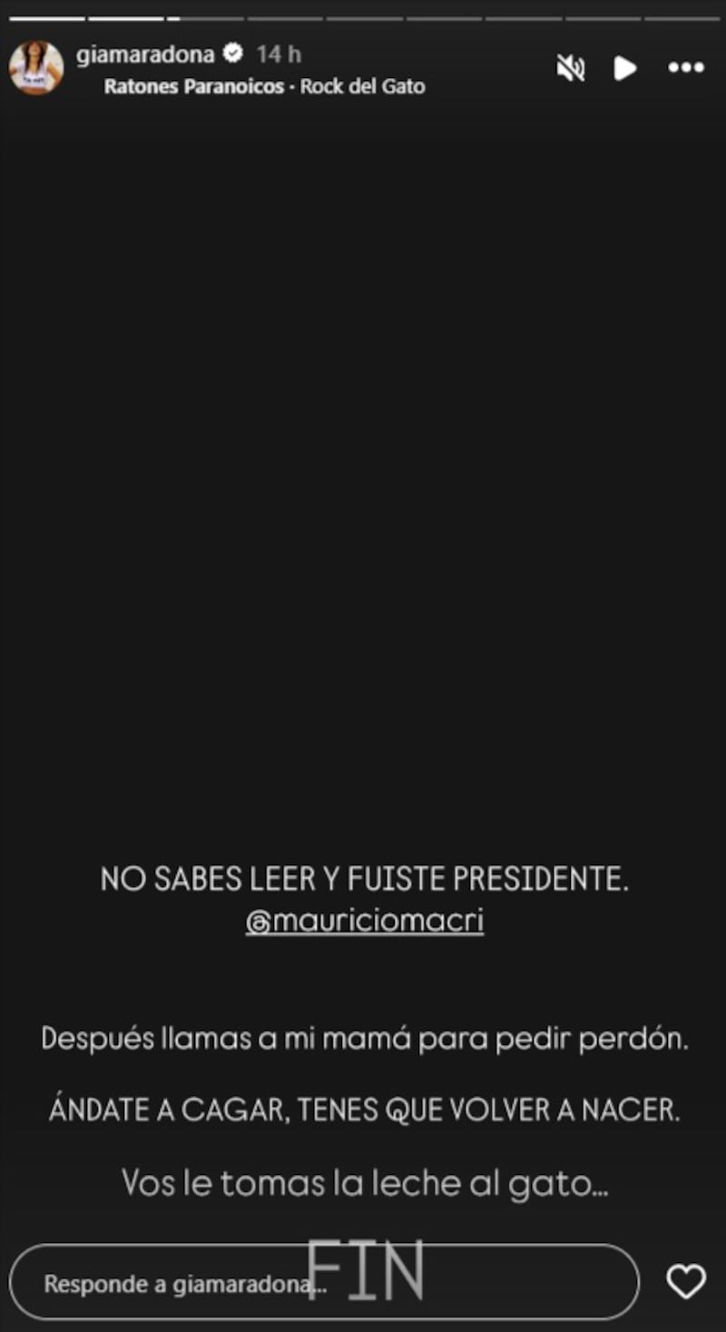 Gianinna recordó también el apodo de Macri, musicalizando su posteo en redes con el “Rock del Gato”, y con un mensaje más duro que inició con otra frase del Diego: “No sabés leer y fuiste presidente. Después llamás a mi mamá para pedir perdón. Andate a cagar, tenés que volver a nacer. Vos le tomás la leche al gato”.