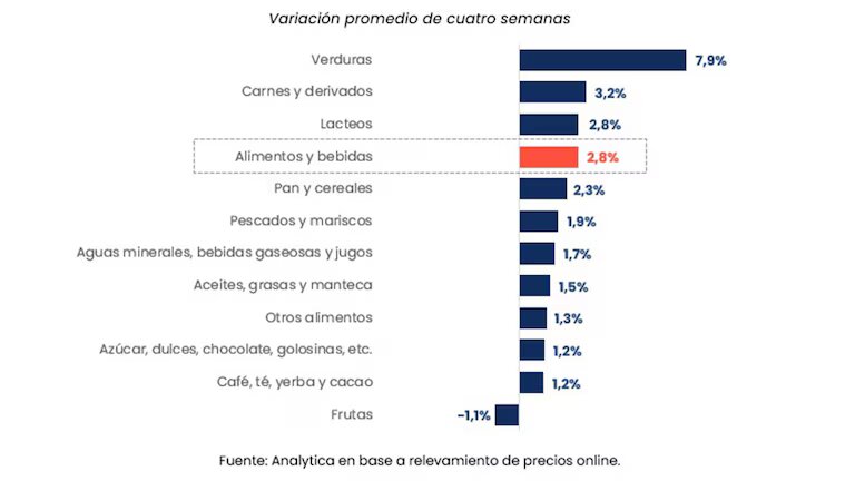 El mayor aumento en este período se dio en verduras (+7,9%) y carnes y derivados (+3,2%). Entre las categorías con menores aumentos se encuentran azúcar, dulces y chocolates (+1,2%) y café, té, yerba y cacao (+1,2%). Por otro lado, se registraron reducciones en los precios de las frutas (-1,1%).