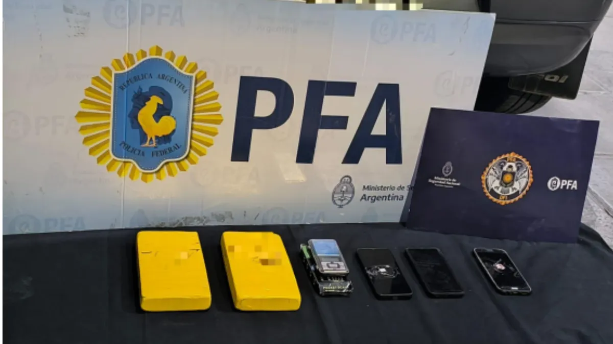 En el vehículo se encontraron dos ladrillos de cocaína con un peso total de 2 kilos, además de teléfonos celulares y otros elementos de interés para la causa. Los dos hombres quedaron detenidos en el lugar.