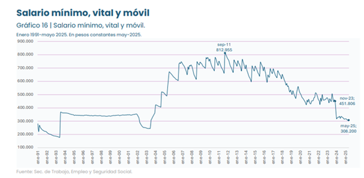 Respecto al salario, entre noviembre de 2023 y mayo de 2025 el salario mínimo real acumuló una caída de 32%, que lo ubica en términos reales de mayo de 2025 en un valor inferior al de 2001, antes del colapso de la convertibilidad.