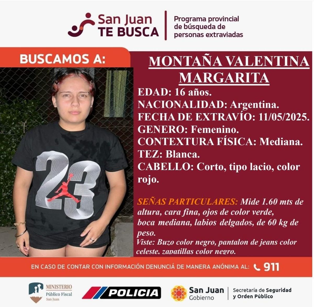 Las fuerzas de seguridad de San Juan activaron un importante operativo de búsqueda para dar con el paradero de Valentina Margarita Montaña, una adolescente de 16 años que lleva cinco días desaparecida.