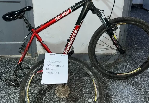 Dos jóvenes de 21 años fueron aprehendidos en el Barrio Grimalt, en Capital, acusados de encubrir el robo de una bicicleta rodado 26” que había sido sustraída días antes en Ullum. La intervención policial permitió que la dueña del vehículo recuperara el rodado tras identificarlo en una vivienda del barrio.