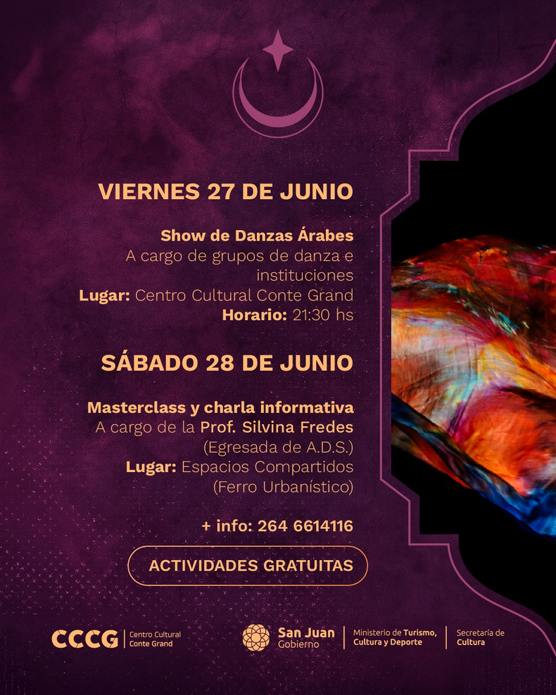 El Ministerio de Turismo, Cultura y Deporte, a través de la Secretaría de Cultura, invita a la comunidad sanjuanina a disfrutar de un evento único que celebra la danza y la cultura árabe con actividades gratuitas durante dos jornadas consecutivas.