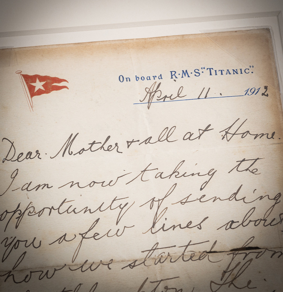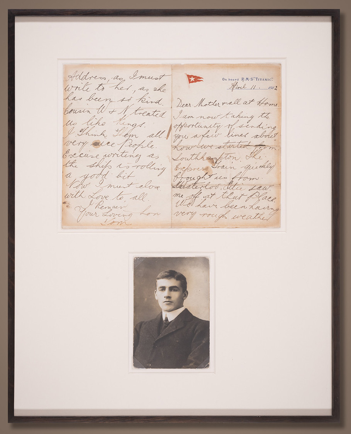 “Querida madre y todos los que están en casa: Aprovecho para escribirles unas líneas sobre cómo partimos de Southampton […] Hemos tenido un tiempo muy duro, pero el barco está tan estable que apenas se notaría su movimiento de no ser por el rugido de los motores. Ahora nos estamos acercando a Queenstown [Irlanda]”, reza la carta, enviada precisamente desde ese puerto irlandés (ahora llamado Cobh) que fue la última escala del Titanic antes de partir rumbo a Nueva York.