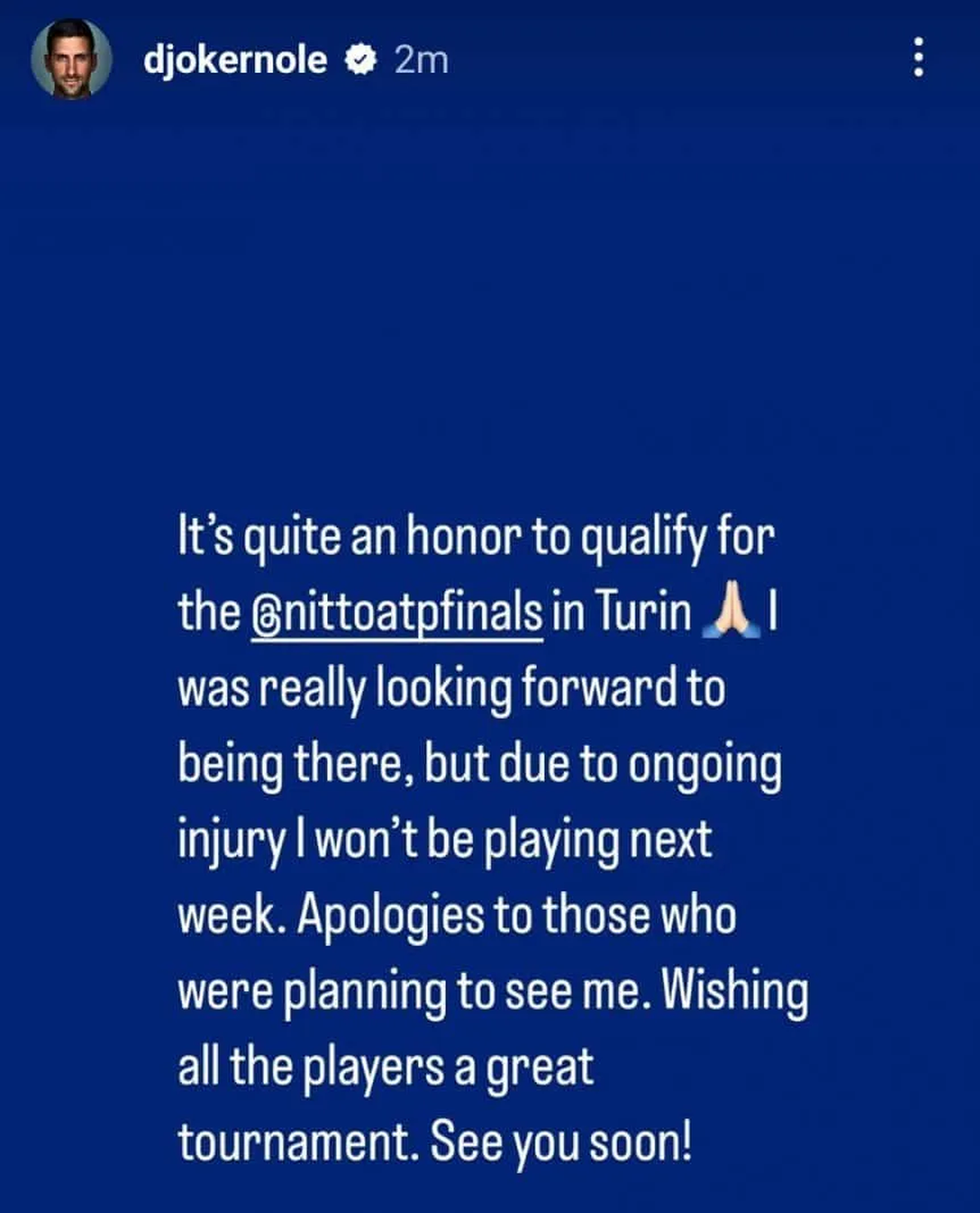 “Es un gran honor clasificarse para las Nitto ATP Finals en Turín. Tenía muchas ganas de estar allí, pero debido a una lesión no jugaré la próxima semana. Disculpas a aquellos que planeaban verme. Les deseo a todos los jugadores un gran torneo. Nos vemos pronto”, escribió Nole en su cuenta de Instagram, dejando en claro que tratará de preservar su físico para volver “más fuerte” el próximo año.