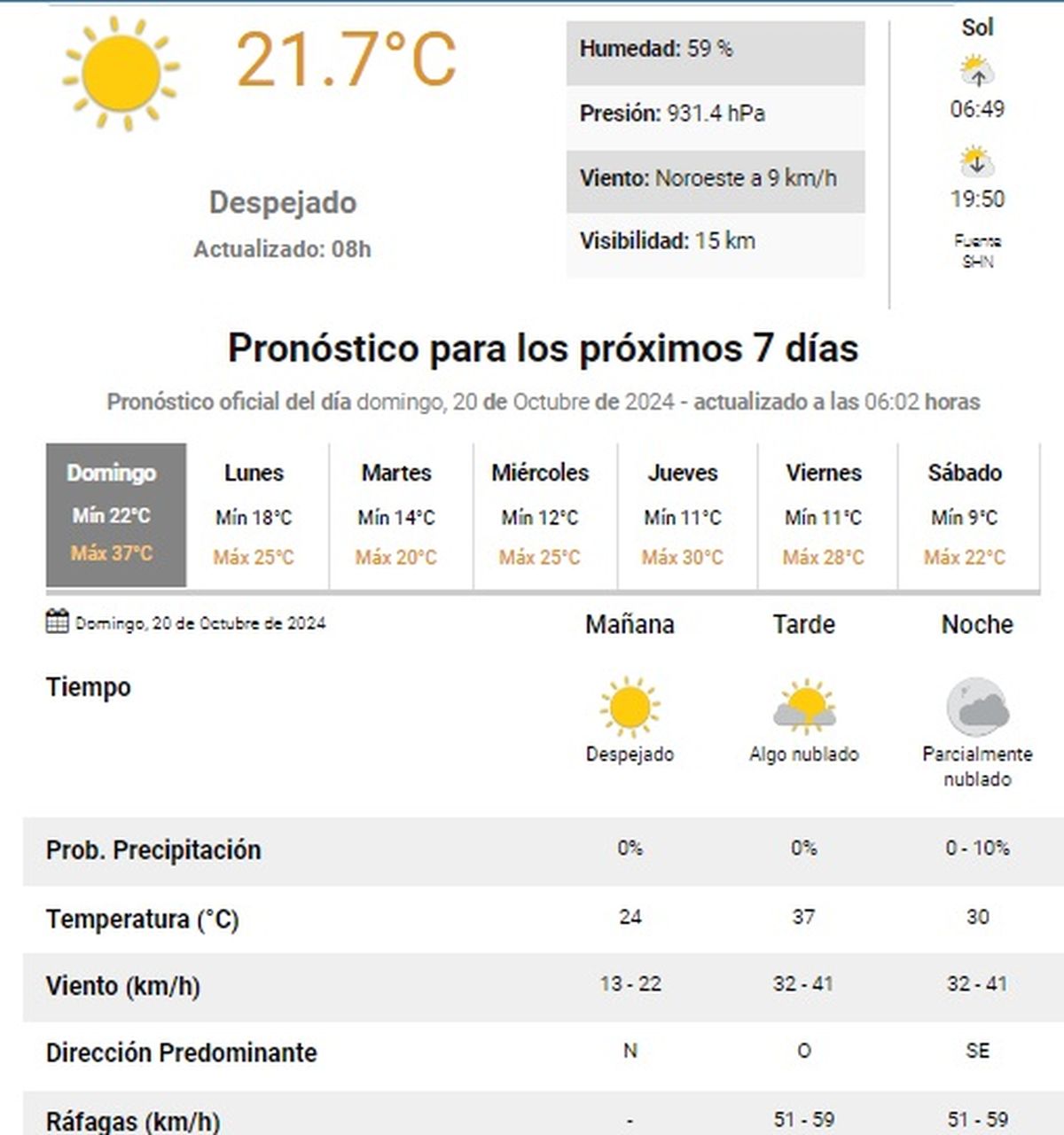 La máxima esperada es de 37°C, según informó el Servicio Meteorológico Nacional (SMN) El cielo continuará despejado y de algo a parcialmente nublado para la tarde noche.
