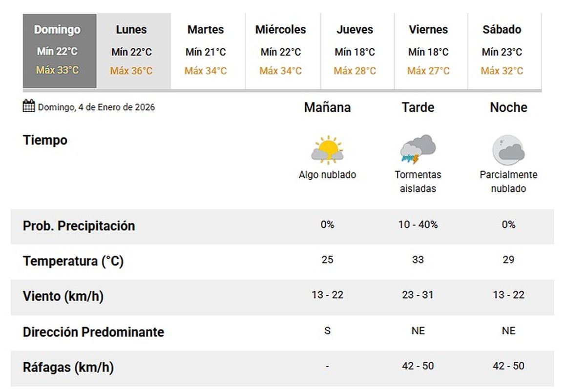 La jornada comenzó con 20,7°C y viento del sur. El SMN prevé calor, rotación del viento al noreste y probabilidad de tormentas aisladas hacia la tarde. El lunes se espera más calor y ráfagas intensas.