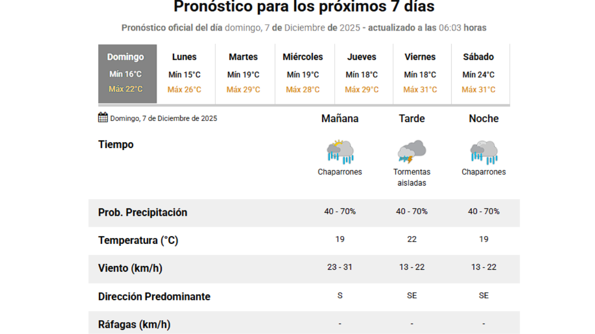 Según informó el SMN, la temperatura máxima llegaría a los 22°C, y continuará la posibilidad de concurrencia de chaparrones y tormentas aisladas, con hasta un 70% de probabilidad, con brisa del sector sur.