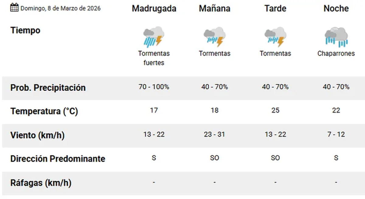 Durante la madrugada y el inicio del día, las precipitaciones estuvieron muy presentes y dejaron un amanecer húmedo y con cielo completamente cubierto. La temperatura se ubicó alrededor de los 17°C, mientras que el viento sopló desde el sector sur, aportando una sensación térmica fresca.