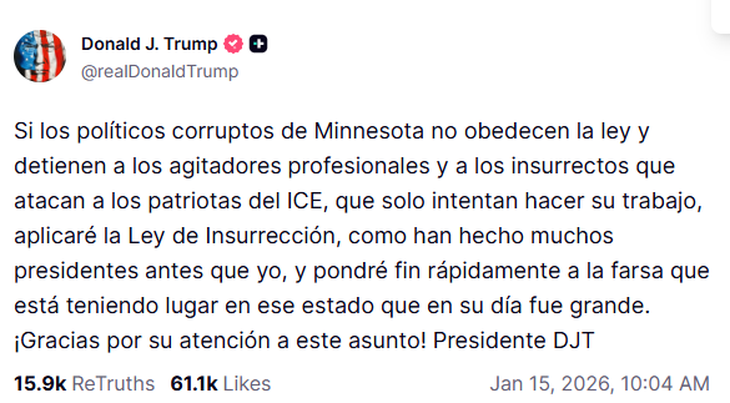 Donald Trump amenaza con aplicar la Ley de Insurrección en Minnesota.