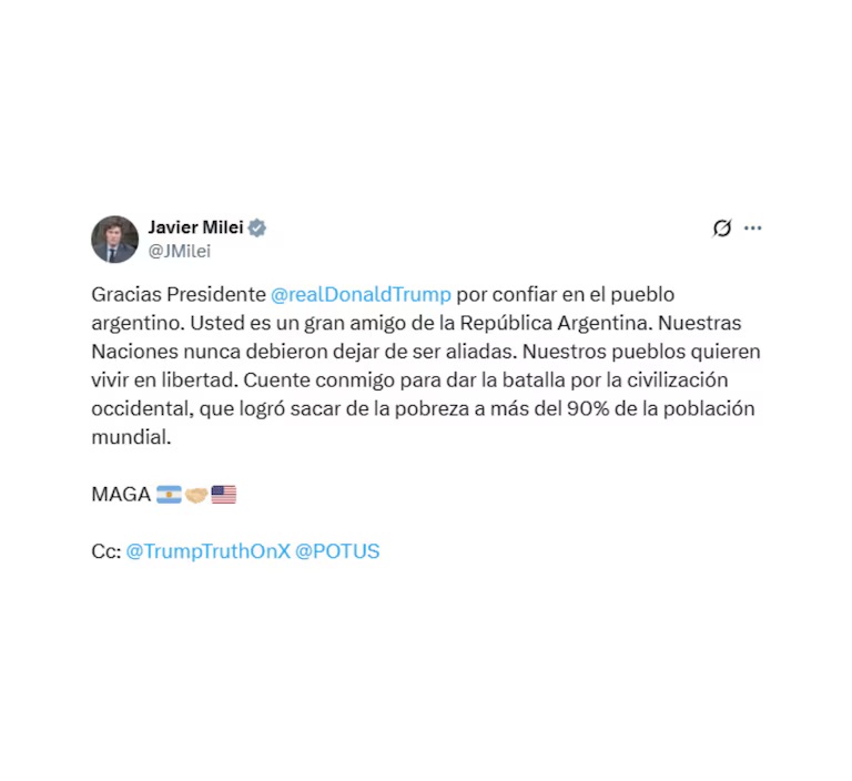 Por su parte, el libertario contestó: “Gracias Presidente Donald Trump por confiar en el pueblo argentino. Usted es un gran amigo de la República Argentina. Nuestras Naciones nunca debieron dejar de ser aliadas. Nuestros pueblos quieren vivir en libertad. Cuente conmigo para dar la batalla por la civilización occidental, que logró sacar de la pobreza a más del 90% de la población mundial”.