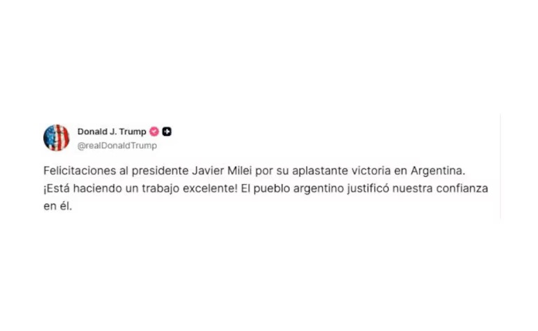 “Felicitaciones al presidente Javier Milei por su aplastante victoria en Argentina. ¡Está haciendo un trabajo excelente! El pueblo argentino justificó nuestra confianza en él”, escribió el mandatario estadounidense a través de su cuenta de Truth.