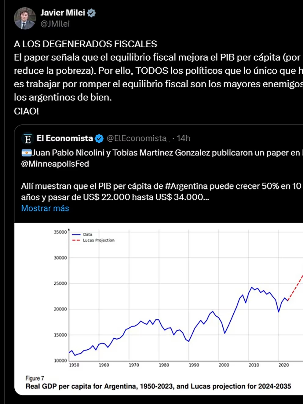 El mandatario replicó un estudio de Juan Pablo Nicolini y Tobías Martínez González que sostiene que Argentina podría incrementar su PBI per cápita en un 50% en una década si mantiene la disciplina fiscal. Usando este informe como respaldo, Milei reiteró su rechazo hacia quienes considera responsables de un manejo desmedido de las finanzas públicas.