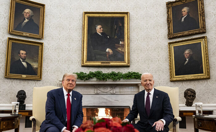Trump y Biden hablaron a la prensa durante poco menos de un minuto antes de continuar la reunión a puerta cerrada, sentados uno junto al otro en sillones, con el fuego de la chimenea crepitando de fondo. “Bueno, señor presidente electo y antiguo presidente, Donald, felicidades. Espero que tengamos, como ya he dicho, una transición pacífica”, expresó Biden mientras Trump lo escuchaba con las manos entrelazadas y ligeramente inclinado hacia adelante en su asiento.