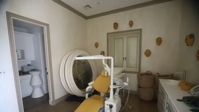 El material difundido incluye imágenes del jardín, dormitorios y una sala con camilla de procedimientos y máscaras de rostros masculinos colgadas en las paredes, uno de los espacios más llamativos dentro del complejo residencial del multimillonario.
