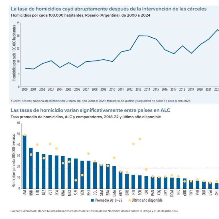 En el informe, el Banco Mundial destacó que “países como Chile, Bolivia, Perú y Argentina reportan tasas de homicidio relativamente bajas en relación con sus niveles generales de crimen”, pero resaltó que en la principal ciudad de Santa Fe se puso en marcha un programa para enfrentar la violencia narco.
