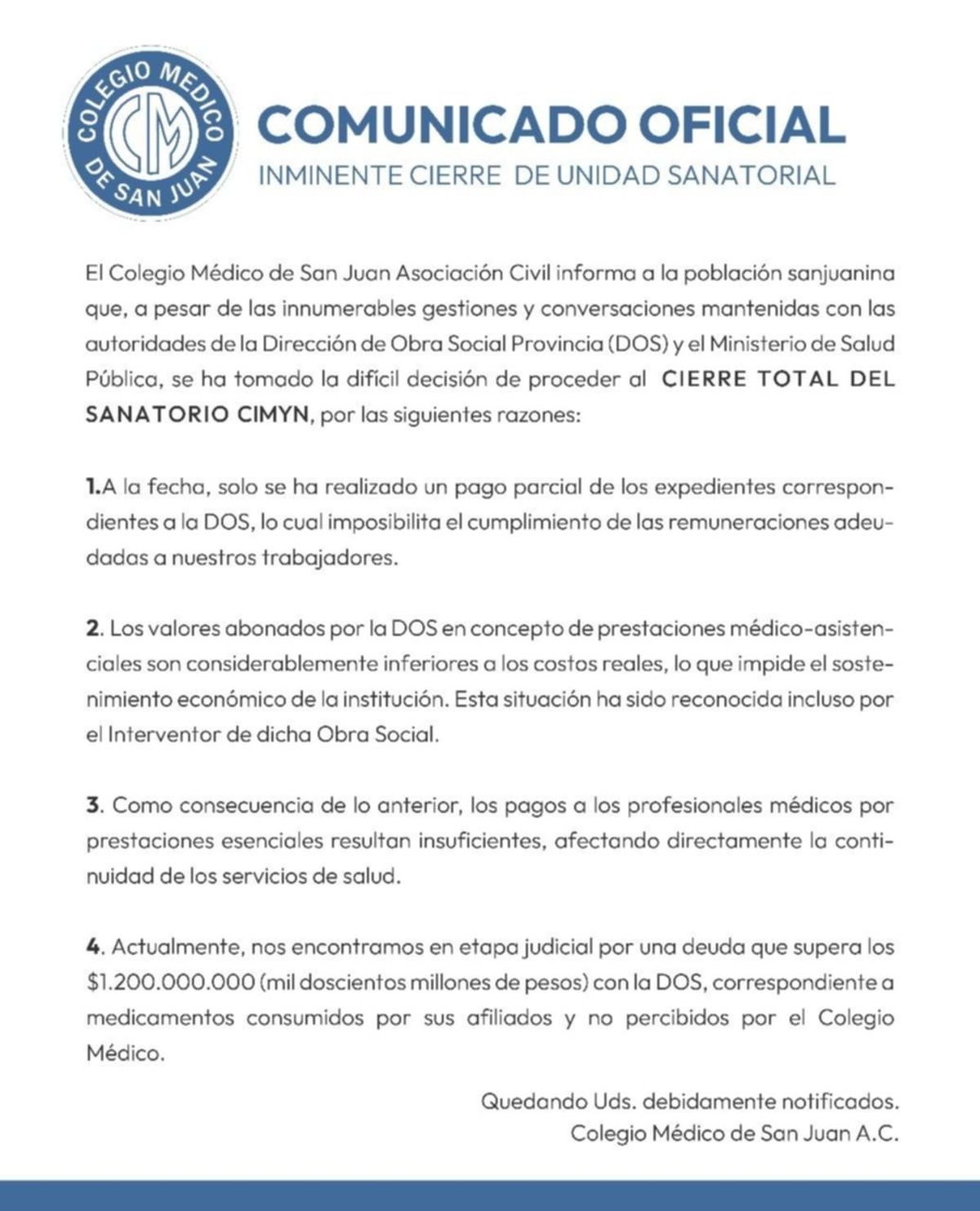 En la noche del viernes, el Colegio Médico de San Juan informó la decisión del cierre total del Sanatorio CIMYN.