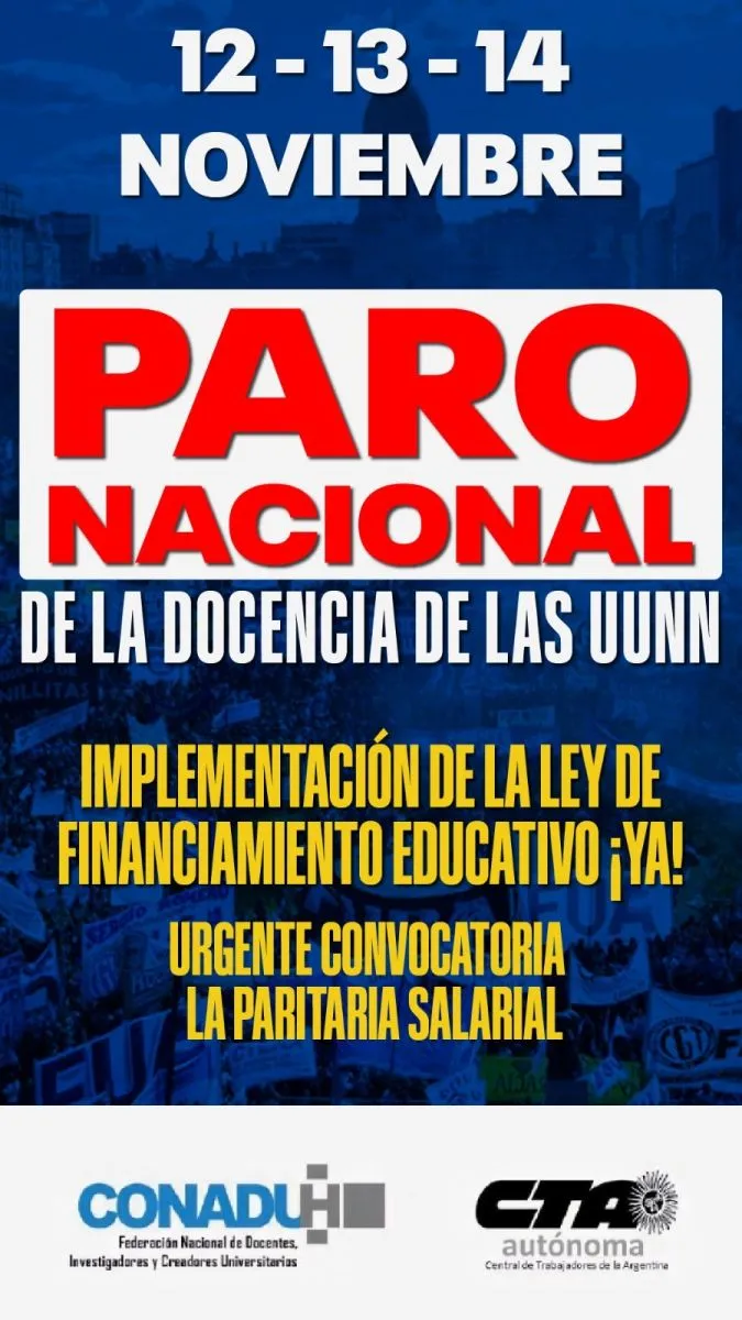 Los docentes universitarios volverán a paralizar sus actividades esta semana. La Confederación Nacional de Docentes Universitarios Línea Historia (CONADUH) convocó a un paro nacional de 72 horas que se cumplirá los días miércoles 12, jueves 13 y viernes 14 de noviembre, en reclamo de mejoras salariales y mayor financiamiento para el sistema universitario público.