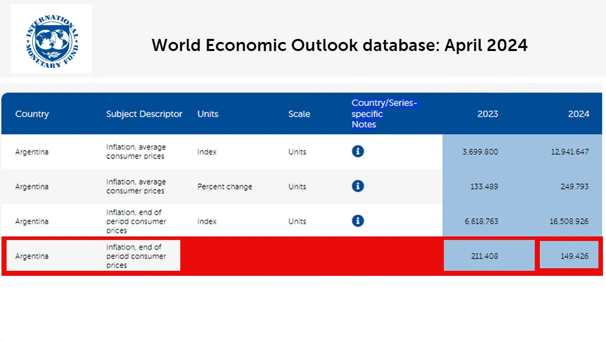 En ese contexto, la previsión para la Argentina es del 249,8% para este año, pero en la proyección punta a punta se estima que a fines de este año esté en el 149,4%. Y bajará sensiblemente en 2025: se estima que sea del 59,6%.