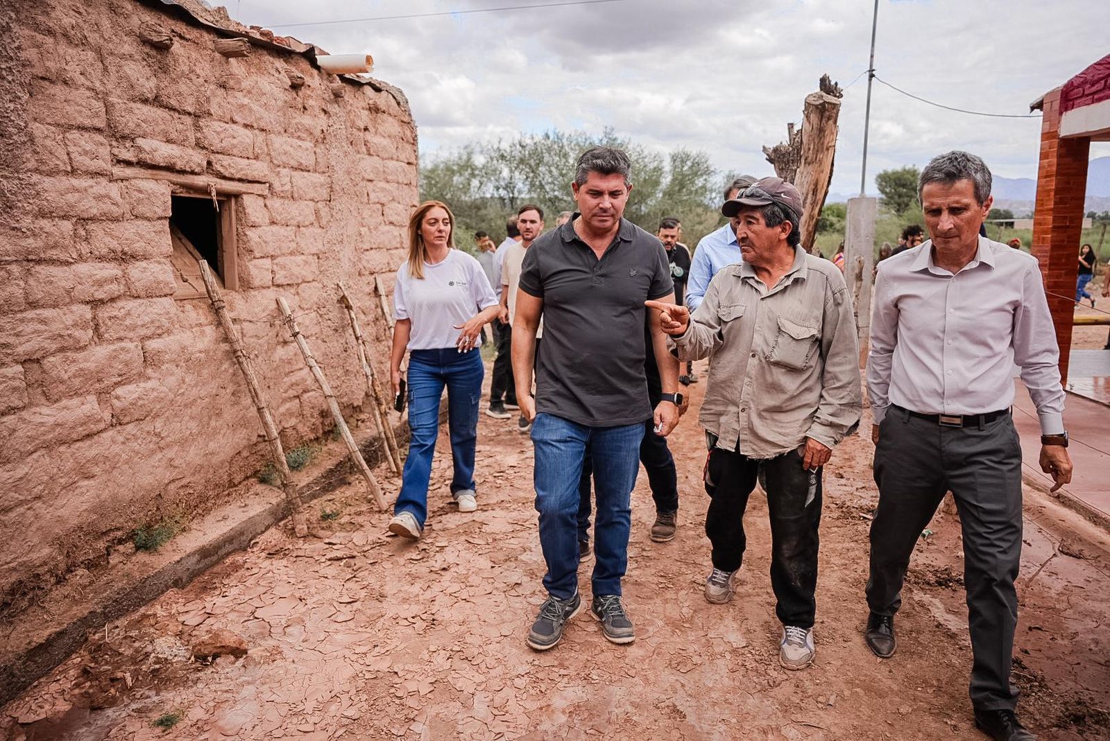 En la recorrida, el mandatario estuvo acompañado por funcionarios del Ministerio de Infraestructura, Hidráulica, OSSE, el Ministerio de Familia y el intendente de Jachal, Matías Espejo, con el objetivo de coordinar las tareas de asistencia y reconstrucción.