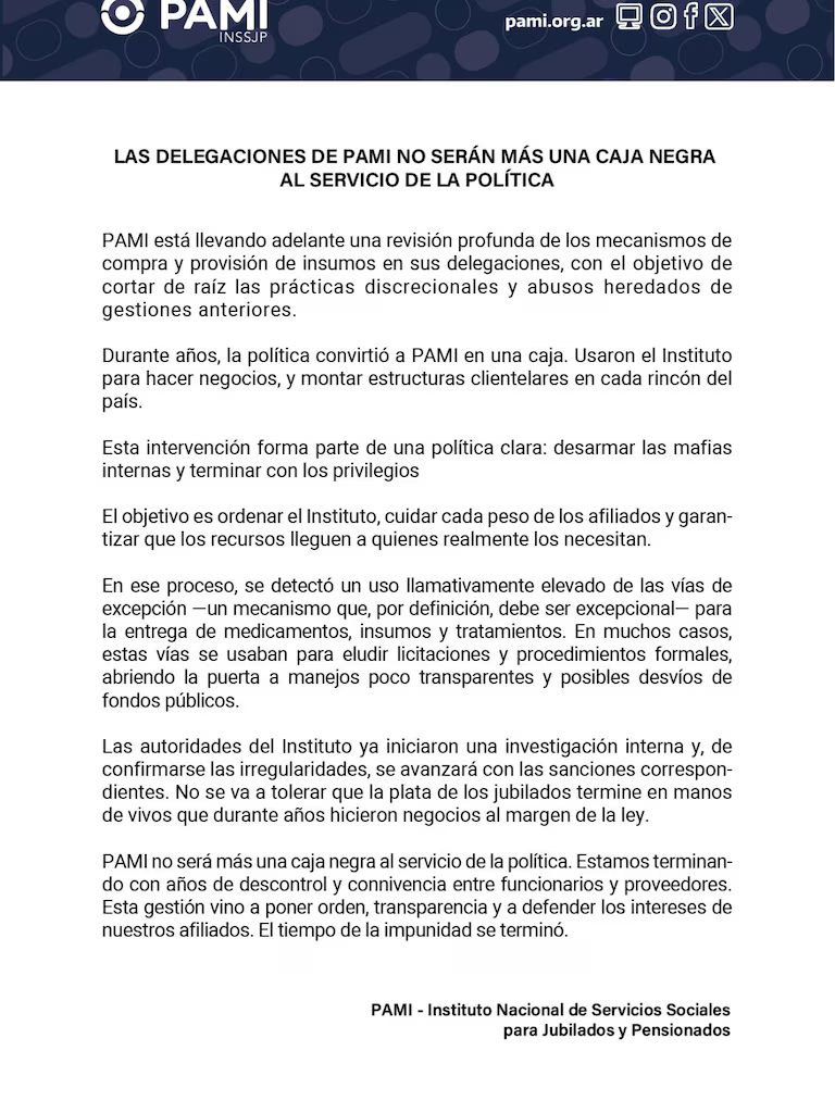 PAMI anunció a principios de mayo una “revisión profunda en sus delegaciones” con la intención de erradicar prácticas discrecionales y abusos vinculados con gestiones anteriores. “Durante años, la política convirtió al instituto en un instrumento para hacer negocios y establecer estructuras clientelistas”, expresó el organismo en su comunicado oficial, donde remarcó que se avanzará con sanciones si se confirman las irregularidades.