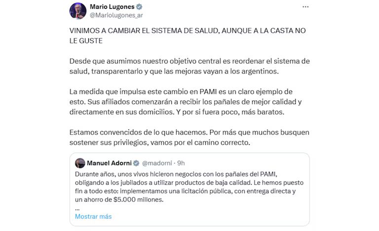 Por otro lado, Mario Lugones, el ministro de Salud de la Nación, complementó el mensaje de Adorni con una publicación en sus redes: “Vinimos a cambiar el sistema de salud, aunque a la casta no le guste”.
