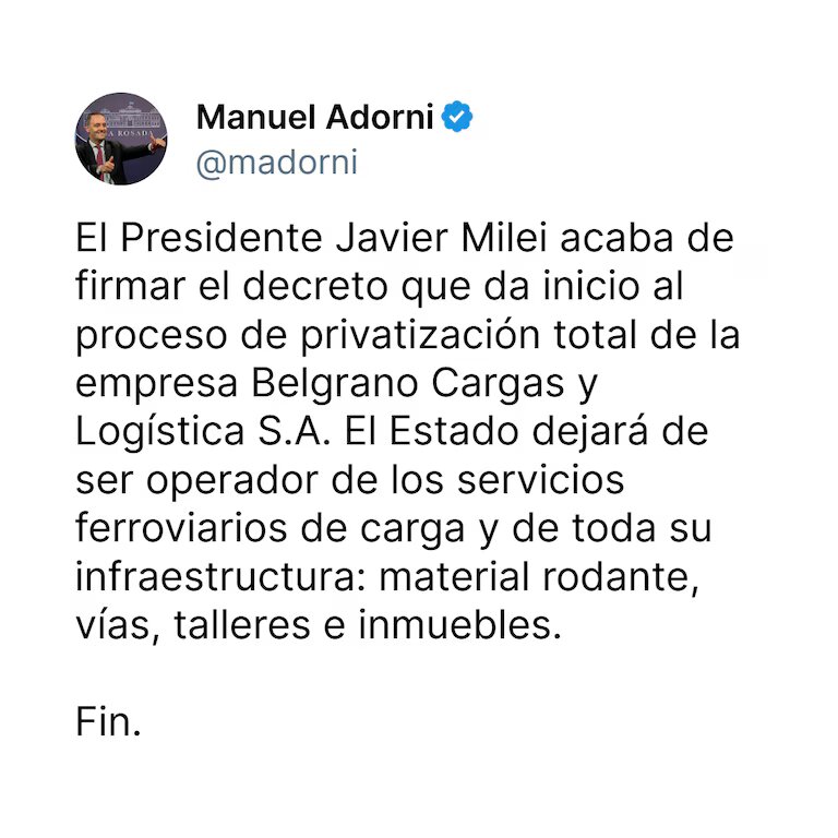 Durante la conferencia de prensa de octubre, el vocero presidencial, Manuel Adorni, afirmó que “sin la intromisión inútil del Estado, la privatización del Belgrano Cargas va a aumentar su competitividad, transparencia y eficiencia”.