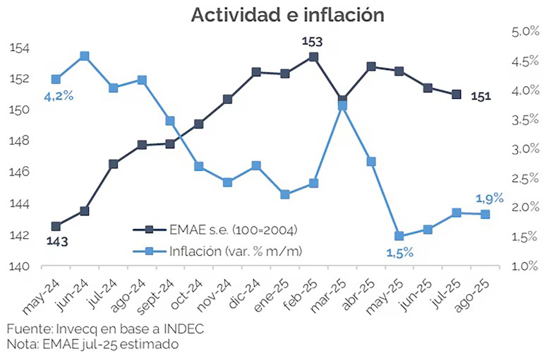 En el mientras tanto, precisa Invecq, la dinámica económica muestra dos caras de una misma realidad: por un lado, la inflación se mantiene contenida en torno al 2% mensual, con un traslado acotado de la depreciación reciente a precios; por el otro, la actividad permanece estancada desde fines de 2024 y acumula señales crecientes de contracción, especialmente en sectores urbanos generadores de empleo.