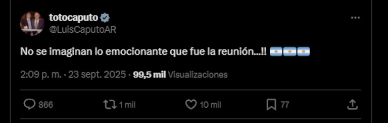 A la espera, como el resto del Gobierno, de un comunicado del Tesoro, Luis Caputo dijo en un breve contacto con la prensa, ayer, desde Nueva York, que se habló de una “cifra concreta” en los intercambios con el gobierno estadounidense, pero no quiso develar el monto pedido o discutido. Sí se encargó de resaltar, en esa entrevista como en sus redes sociales, la parte emotiva del encuentro con Trump, que consideró “impresionante”, en un tuit, y “emocionante” en otro. Y