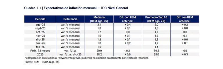En particular, para agosto los especialistas estiman un incremento de 2,1%. Para septiembre anticipan una suba de los precios del 1,8% y para octubre anticipan un 1,7%. Para el total de los doce meses del 2025, la inflación cerraría en 28,2%, de acuerdo a los expertos consultados por el BCRA.