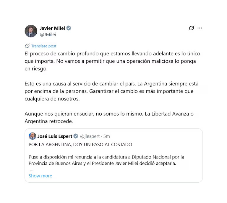 “Garantizar el cambio es más importante que cualquiera de nosotros. Aunque nos quieran ensuciar, no somos lo mismo. La Libertad Avanza o Argentina retrocede”, escribió el Presidente, al comentar otro posteo que hizo previamente Espert.