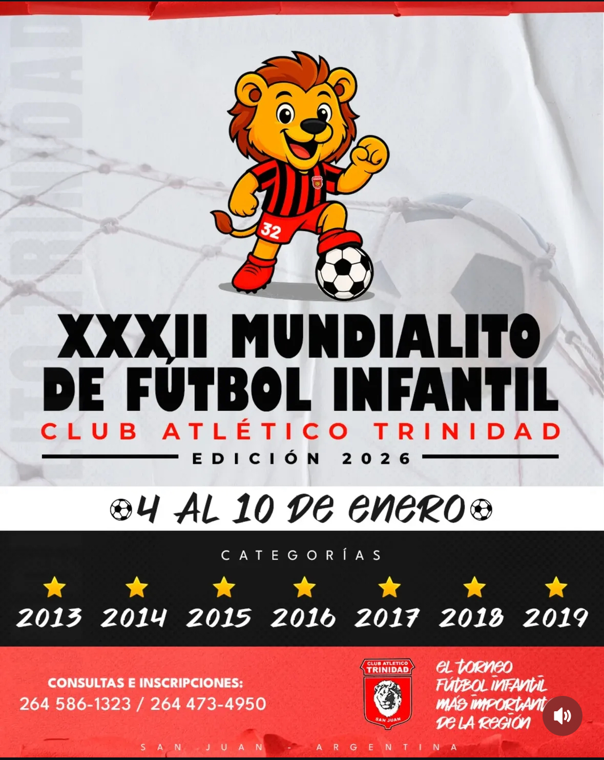 Del 4 al 10 de enero se desarrollará la 32° edición del Mundialito de Trinidad, uno de los torneos infantiles más emblemáticos del fútbol sanjuanino y un clásico del calendario deportivo de verano. Año tras año, el certamen convoca a miles de niños y niñas, transformando al departamento en un punto de encuentro para el deporte, las familias y las comunidades que llegan desde distintos rincones del país y del extranjero.
