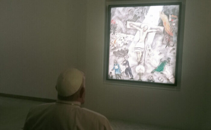 El papa Francisco acudió este domingo al centro de Roma para ver la exposición del que en alguna ocasión ha manifestado es su cuadro favorito, La Crucifixión blanca de Marc Chagall, expuesto en el Palacio Cipolla, en uno de los eventos culturales de preparación al Jubileo.