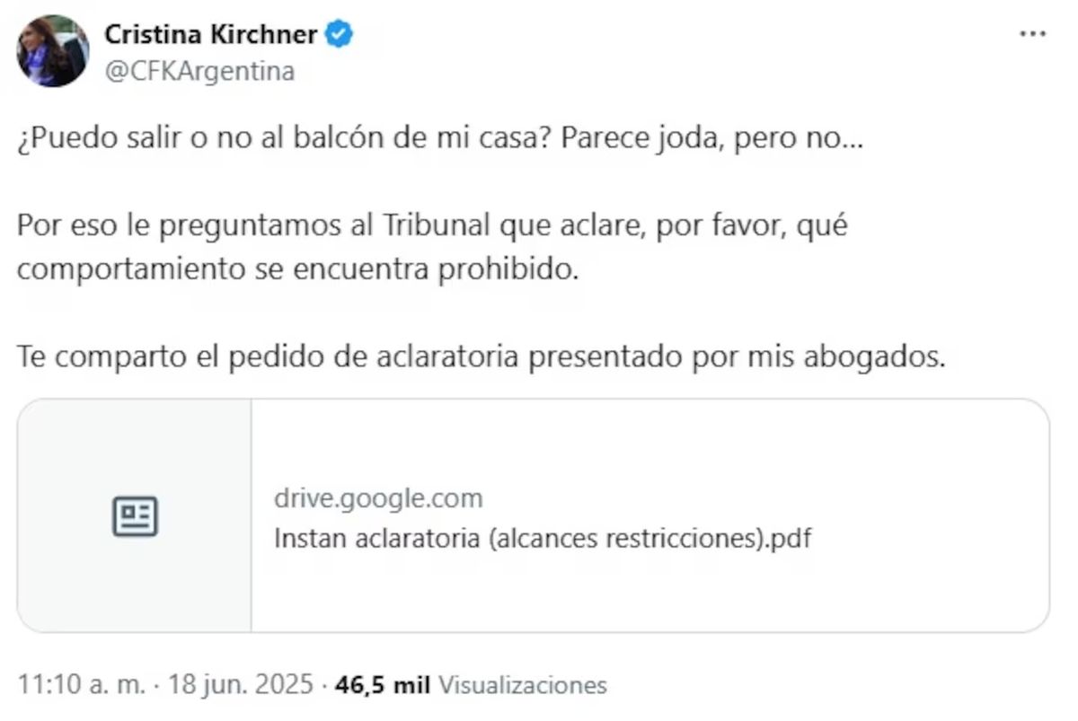 La expresidenta publicó en su cuenta de X: “¿Puedo salir o no al balcón de mi casa? Parece joda, pero no… Por eso le preguntamos al Tribunal que aclare, por favor, qué comportamiento se encuentra prohibido”. La dirigente adjuntó en el mensaje el pedido de aclaratoria presentado por sus abogados, Carlos Beraldi y Ary Llernovoy, al Tribunal Oral Federal 2 (TOF 2), que la condenó por la causa Vialidad.