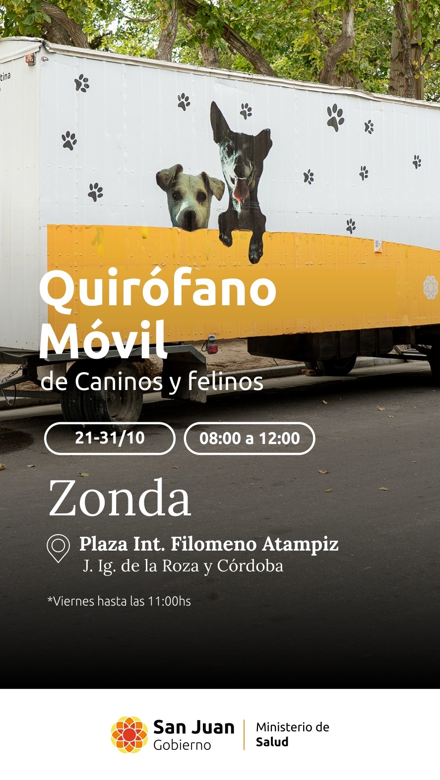 El quirófano móvil de mascotas desde el martes 21 al 31 de octubre se encuentra en la Plaza Int. Filomeno Atampiz, departamento Zonda, en el horario de 08:00 a 12:00 horas.