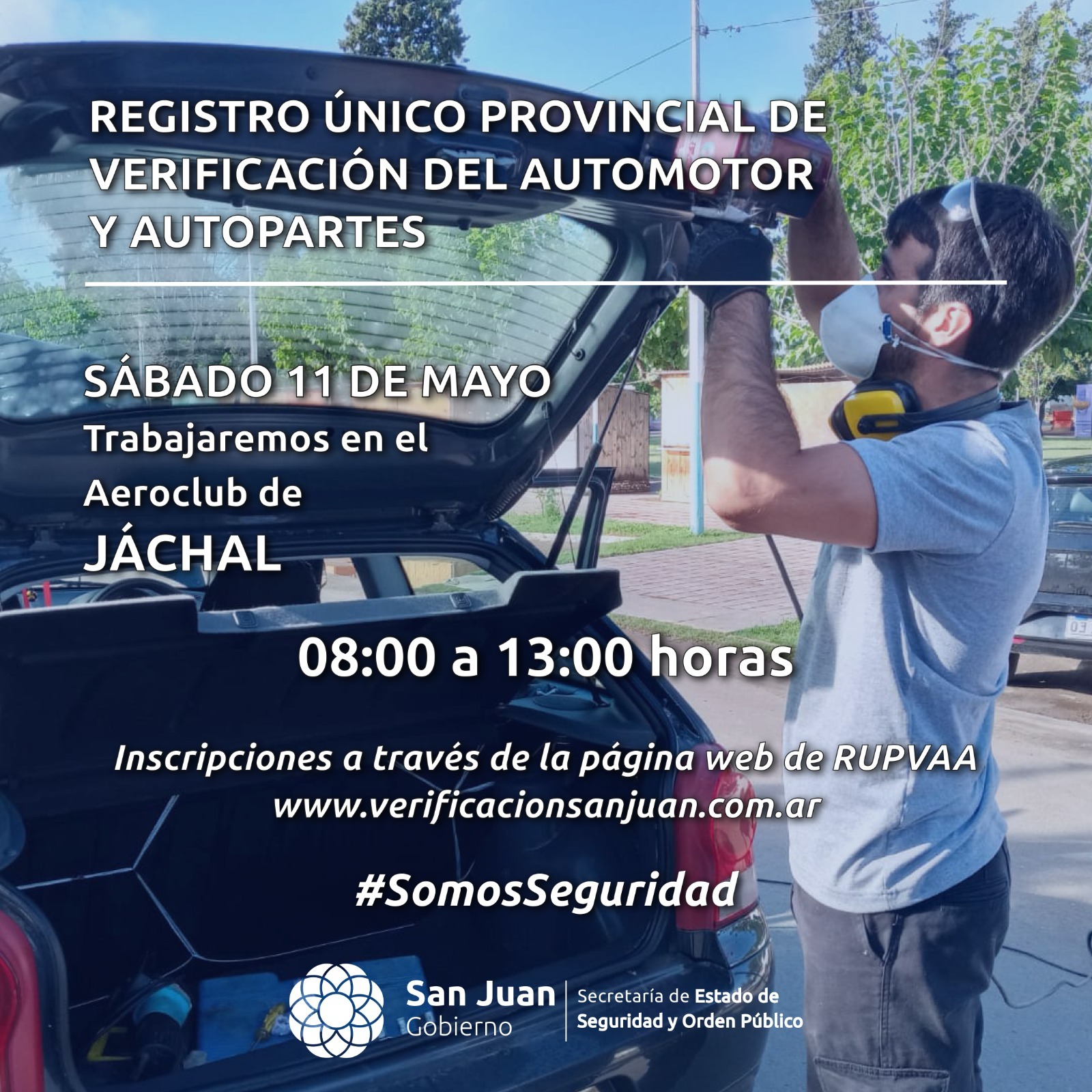 La Secretaría de Estado de Seguridad y Orden Público, a través de la Dirección del Registro Único Provincial de Verificación Automotor y Autopartes, informa que el próximo sábado 11 de mayo se llevará a cabo un nuevo operativo especial en el departamento Jáchal.