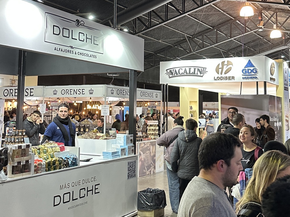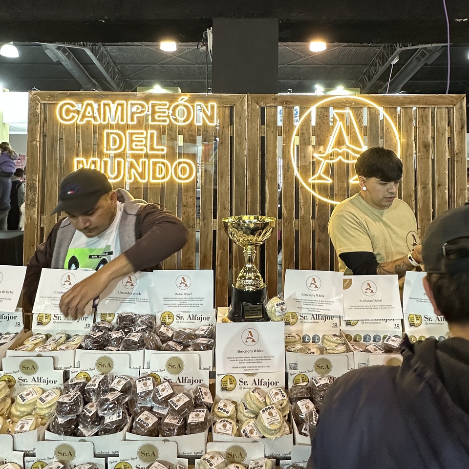 Y claro, no podía faltar el costado más tentador: los puestos repletos de alfajores de todo tipo, desde los clásicos de dulce de leche y chocolate, hasta combinaciones más creativas —y en algunos casos, directamente extravagantes—. Más de setenta stands se distribuyeron por el predio, con la participación de marcas consolidadas y de pequeños emprendimientos que buscaban abrirse camino en el paladar del público. Entre ellos destacó Sr. Alfajor, la firma de Monte Grande que el año pasado se había consagrado como el “Mejor Alfajor 2024”, y que esta vez ocupó un lugar central. También hubo espacio para una importante cadena de cafeterías argentinas, una reconocida marca de dulce de leche y hasta emprendimientos que ofrecían soluciones innovadoras: desde packaging de diseño hasta robots capaces de automatizar la producción y proveedores de materias primas.