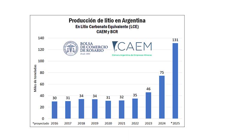 La Argentina podría alcanzar un nuevo techo en producción de litio en 2025. Según la Bolsa de Comercio de Rosario (BCR), junto a datos provistos por la Cámara Argentina de Empresas Mineras (CAEM), el país produciría aproximadamente 131.000 toneladas de carbonato de litio equivalente (LCE) durante ese año. Esta cifra representa un aumento del 75 % con respecto a 2024, impulsado por la incorporación de nuevos proyectos operativos y la expansión de plantas ya existentes bajo el Régimen de Incentivo para Grandes Inversiones (RIGI).
