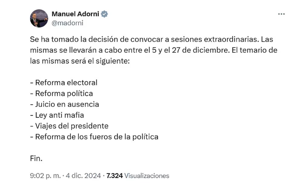 Según anunció el vocero presidencial, las extraordinarias -sólo se debaten los temas que propone el Ejecutivo- se iban a extender hasta el próximo 27 de diciembre. En ese período, el oficialismo, siempre en base a los dichos de Adorni, iba a proponer que se traten proyectos de Reforma electoral, Reforma política, Juicio en ausencia, Ley anti mafia, Viajes del presidente y Reforma de los fueros de la política.