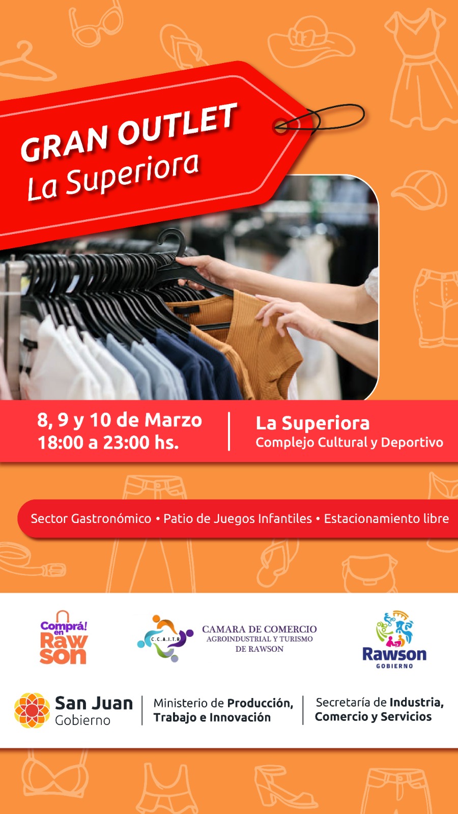 El ministerio de Producción, Trabajo e Innovación a través de la secretaría de Industria, Comercio y Servicios invita al “Gran Outlet La Superiora”, que promete ser igual de exitoso que la primera edición realizada durante el mes de febrero en Rawson. En esta oportunidad participarán alrededor de 70 comercios del departamento en el que ofrecerán liquidaciones de temporadas con ofertas que oscilan desde el 10% al 80% en descuentos.