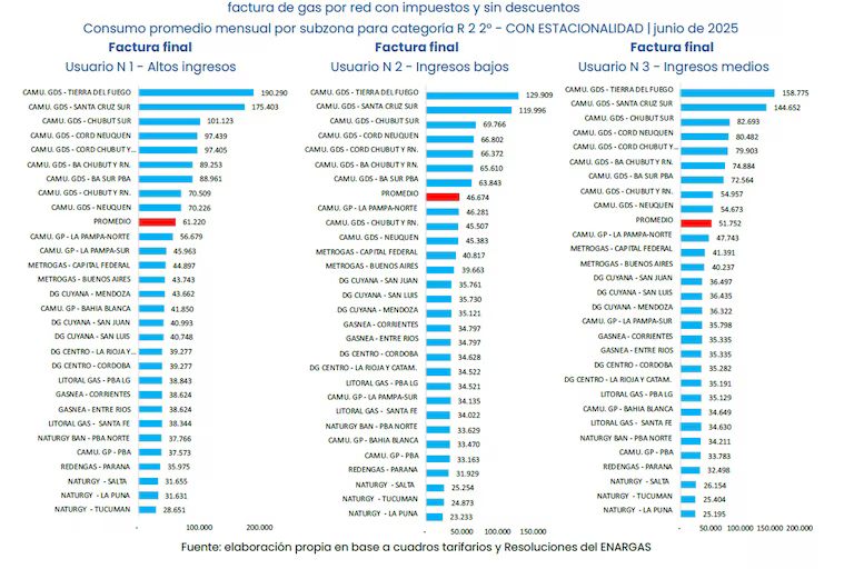 En el caso de los usuarios N1, que no acceden a subsidios estatales, la factura media a nivel país fue la más elevada del sistema, con Tierra del Fuego a la cabeza: allí, una familia con ingresos altos pagó $190.290 (antes de descuentos). Le siguieron Santa Cruz Sur ($175.403) y Chubut Sur ($101.123). En el otro extremo, los usuarios N1 con menores facturas se localizaron en Tucumán ($28.651), La Puna ($31.631) y Salta ($31.655).