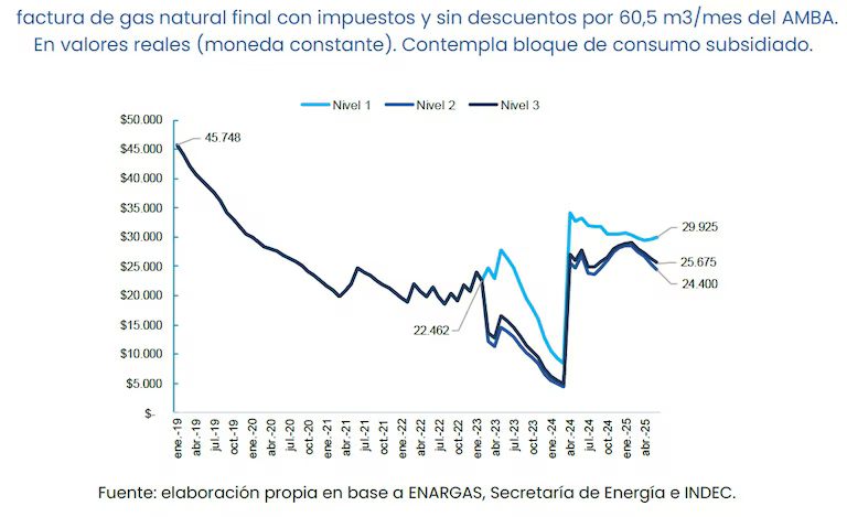 La factura promedio mensual de gas natural por redes para usuarios residenciales superó por primera vez los $50.000 a nivel nacional en junio de 2025, impulsada por los nuevos cuadros tarifarios sancionados ese mes, que actualizaron tanto el cargo fijo como el cargo variable. Los hogares de ingresos altos (usuarios N1) abonaron, en promedio, $61.220; los de ingresos medios (usuarios N3), $51.752; y los de ingresos bajos (usuarios N2), $46.674, según un informe publicados por el Observatorio de Tarifas y Subsidios IIEP (UBA – Conicet).