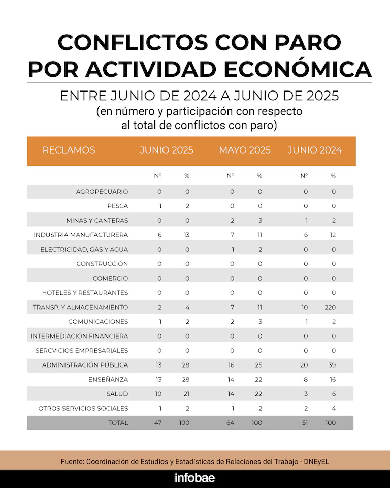 Al considerar los sectores de actividad se observó que en junio de 2025 el 89% de los conflictos con paro se registraron en las siguientes actividades: la administración pública (13), la enseñanza (13), la salud (10), y la industria manufacturera (6).