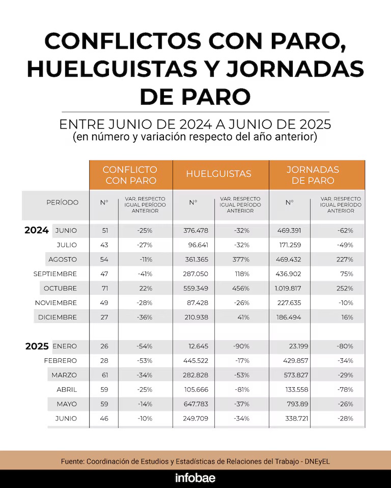 Este cambio se produjo en un contexto de descenso generalizado de los indicadores de huelga, según estadísticas que la Secretaría de Trabajo difundirá en las próximas horas, en donde se menciona que junio pasado cerró con 46 conflictos laborales con paro, lo que representa una baja del 10% respecto a junio de 2024 y una caída del 22% en comparación con mayo de 2025.